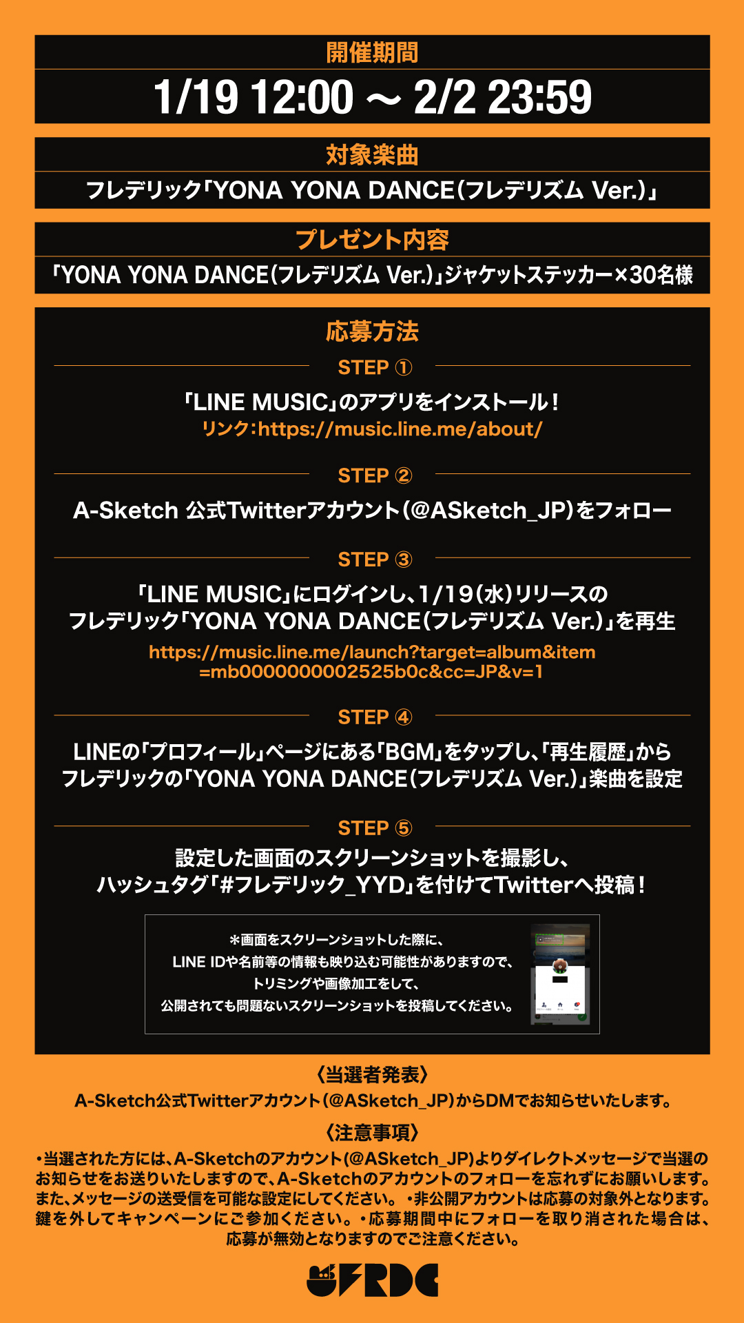 フレデリックの「YONA YONA DANCE(フレデリズム Ver.)」をご自身のLINEプロフィールのBGMに設定していただき、設定画面の画像をTwitterでハッシュタグ #フレデリック_YYD をつけて投稿していただいた方の中から抽選で30名様に「YONA YONA DANCE(フレデリズム Ver.)」ジャケットステッカーをプレゼント!